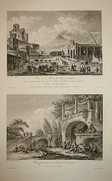 Coppia di acquaforti originale (cm. 24x19,5 ciascuna) su un foglio, tratte dal ‘Voyage pittoresque ou description des Royaumes de Naples et de Sicile’ dell’abate di Saint-Non. Ottimo esemplare.
