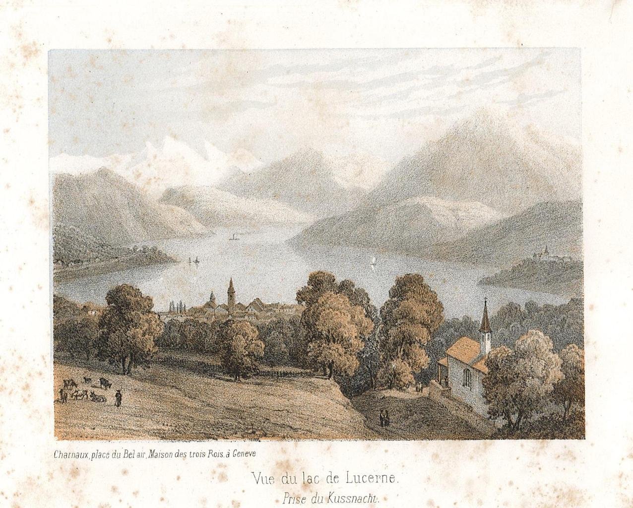 Veduta, antica ed originale, stampata a colori del Lago di Lucerna presa da Kussanacht. Autore: Charnaux edit. Luogo: Lago dei 4 Cantoni. Anno: 1840 ca. Tecnica: litografia. Dimensioni: 100x135 mm