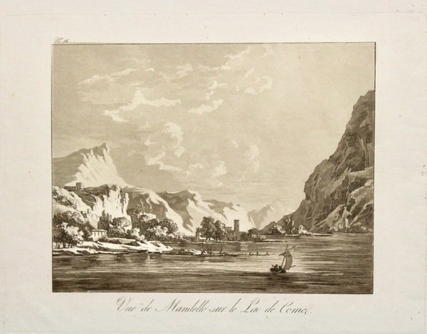 Fascinosa incisione in rame all'acquatinta monocroma grigia, mm 180x234; raffigura una fantastica Mandello sulle rive del lago. Eseguita da uno dei più stimati e innovatori artisti e incisori francesi vissuto tra sette e ottocento. Tratta da " Voyage pittoresque et historique du nord de l'Italie " di Bruun Neergaard. Ottimo esemplare marginosissimo in perfetto stato di conservazione. <BR>