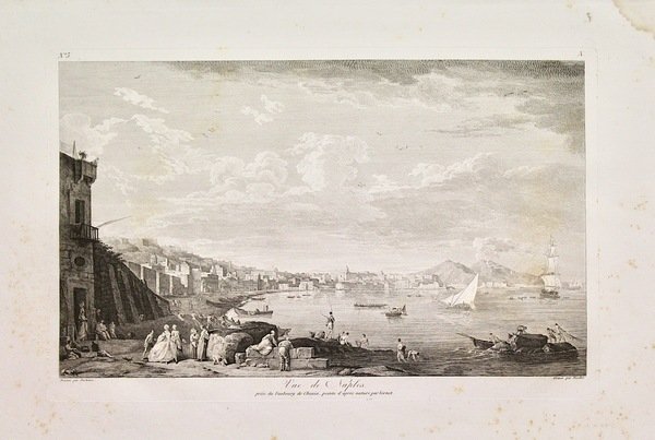 Incisione in rame di Nicollet su disegno di Bertaux, mm 245x385 circa. Tratta dall'edizione ottocentesca di "Voyage Pittoresque ou description des Royaumes de Naples et de Sicile", in assoluto una delle più belle ed eleganti opere descrittive del regno di Napoli: composta da cinque volumi usciti dal 1781 al 1786, rappresentò un enorme sforzo economico e tipografico, ripagato peraltro da un successo enorme di vendite, diventando il modello tipografico su cui si basarono molte posteriori opere di viaggio. Bell'esemplare con ampi margini, qualche fioritura marginale, orlo d'acqua all'angolo sup. destro senza interessare la parte incisa.<BR><BR>