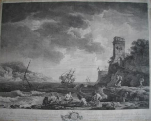Parigi, primi XIX secolo. Incisione in rame all'acquaforte, b/n, cm 60 x 72 (il foglio). Da un dipinto del Vernet e incisa dal Le Bas, bella scena di mare animata da figure di pescatori al lavoro in primo piano, molto suggestiva e narrativa. Buon esemplare seppur rifilato un poco ai margini.