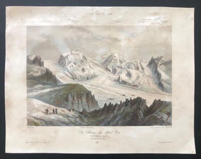 Paris, Charnaux, Genève, 1840 circa. Litografia in colore d'epoca, cm 23 x 29,5 circa (il foglio). Veduta del Gruppo del Monte Rosa con il ghiacciaio del Gorner. Il ghiacciaio del Gorner è un ghiacciaio vallivo che si trova nel Vallese a sud - est di Zermatt e che scende dal gruppo del Monte Rosa, nelle Alpi Pennine. Con i suoi 14 km di lunghezza è il terzo ghiacciaio della Svizzera dopo il ghiacciaio dell'Aletsch e il ghiacciaio di Fiesch. Aloni marginali, alcune abrasioni al margine superiore, tenue e piacevole coloritura, condizioni accettabili.