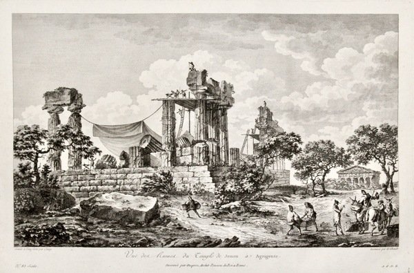 Incisioni in rame di De Ghendt, ca. 245x350. Tratta da "Voyage Pittoresque ou description des Royaumes de Naples et de Sicile", in assoluto una delle più belle ed eleganti opere descrittive del regno di Napoli: composta da cinque volumi usciti dal 1781 al 1786, rappresentò un enorme sforzo economico e tipografico, ripagato peraltro da un successo enorme di vendite, diventando il modello tipografico su cui si basarono molte posteriori opere di viaggio. Bell'esemplare con ampi margini.