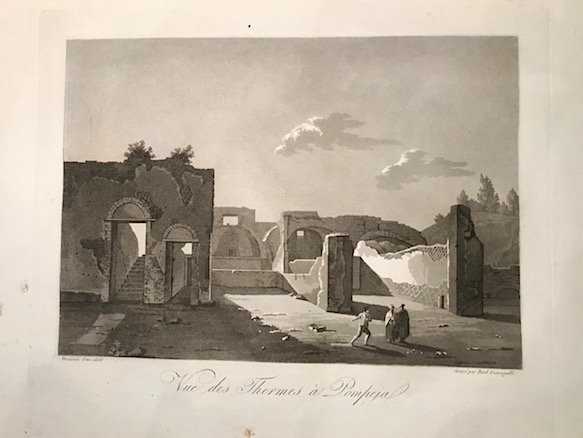 Acquatinta originale (cm. 32x26,5 più ampi margini bianchi) tratta dall’opera ‘Pompeia. Trattato pittorico, storico, e geometrico.’. Piccolo forellino al margine superiore bianco, altrimenti esemplare in ottimo stato di conservazione. Non comune.