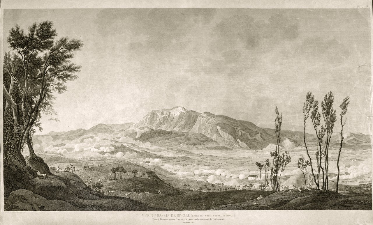 Vue du bassin de Rivoli, (entre les monts Corona et Pipolo). L'armée française attaque l'ennemi et le chasse des hauteurs dont il s'etait emparé