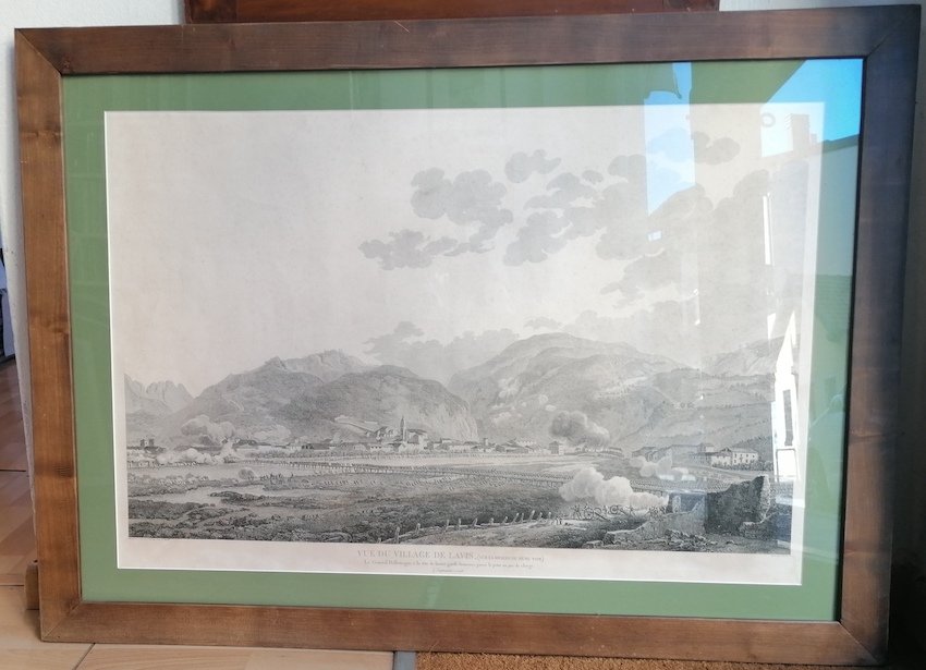 Incisione in acciaio di dimensioni 100x140 cm. Condizioni : USATO - Stato : Buono, ordinari segni d'uso e del tempo. Altre note : Il paese di Lavis fa da sfondo alla battaglia napoleonica occorsa nel settembre del 1796. L'autore, il pittore e architetto torinese Giuseppe Piero Bagetti, seguì l'esercito francese sul campo documentando visivamente la prima campagna di Napoleone in Italia. Pare che per realizzare le vedute studiasse le carte topografiche della zona e interrogasse i protagonisti della vicenda. Disponibile in cornice.