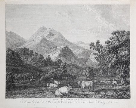 Acquaforte e bulino, 1780 circa, da un dipinto a gouche di Jacob Philip Hackert, datato 1780.L'opera è edita dal fratello di Hackert, Georg Abraham, che aveva una bottega calcografica in Roma a Piazza di Spagna. Magnifica prova, impressa su carta vergata cova, rifilata al rame, in ottimo stato di conservazione. Landscape with a flock of cows in the foreground, a man on horseback in the background to left and a view of the village of Licenza in the distance; after a gouache by Hackert. after 1780 Etching and engraving, 1780 circa.Lettered with the title and 'Et du petit bourg de Civitelle prise sur la route avant d'arriver a la Maison de Campagne d'Horace'; production details ('peint à gouache.); numbered 'No VI' in top left corner. Cfr. R. Nicolas, Balthasar-Antoine Dunker, Ginevra, Editions Albert Ciana, 1924, p. 49.6.