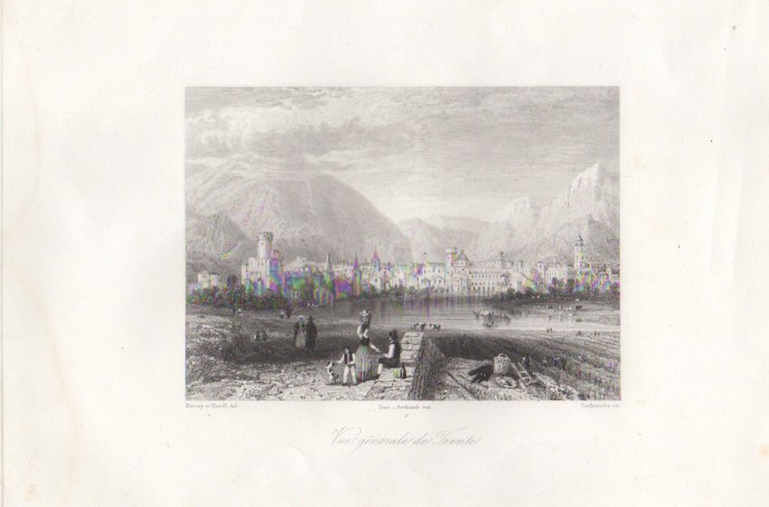 Incisione in acciaio di dimensioni 105x145 mm. Condizioni : USATO - Stato : Buono, ordinari segni d'uso e del tempo. Altre note : Veduta panoramica della città di Trento con accurate scene campestri in primo piano. Lungo il bordo inferiore presenti indicazioni sugli autori "Mercey et Havell" a sx. e sull'incisore "Jacques Outhwaite" a dx. Scheda bibliografica tratta da "Trento nelle Stampe d'Arte" di Aldo Chemelli, scheda n. 42 pagg. 190 e 191.