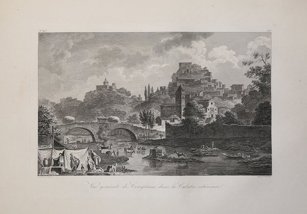 Veduta disegnata da Lousie Jean Desprez, compagno di viaggio e collaboratore dell'Abbé de Saint-Non, incisa da H. Guttemberg e pubblicata ' nel ' Voyage Pittoresque ou description des Royaumes de Naples et de Sicile, opera in 5 volumi per la prima volta stampati a Parigi tra 1781 e il 1786. Richard de Saint-Non conobbe, durante il suo viaggio a Roma, i due già celebri pittori francesi Jean Honoré Fragonard e Hubert Robert, con i quali prosegue il suo viaggio per tutto il paese. Da questa grande amicizia nasce l’idea e la collaborazione per l’ambizioso progetto di documentare graficamente tutti i principali monumenti dell’Italia Meridionale e della Sicilia. Da qui, tra il 1781 ed il 1786, con l’aiuto di numerosi ed importanti architetti, pittori ed incisori, venne alla luce il Voyage Pittoresque ou description des Royaume de Naples et de Sicilie, opera composta di cinque volumi che uscirono annualmente. Incredibile sforzo tipografico, l’opera raccoglie quasi per intero gli appunti di viaggio del Saint-Non, adeguatamente assemblati e corretti; il corpus grafico è composto di ben 542 incisioni all’acquaforte e bulino, opera dei principali artisti di riproduzione del periodo. Da un punto di vista editoriale l’iniziativa riscuote immediatamente un grandissimo successo: il libro diviene un vero e proprio modello tipografico, sul quale sono basate diverse pubblicazioni dell’impero napoleonico. Dal punto di vista artistico le vedute, i paesaggi e le rovine conservano, e non può essere altrimenti, lo stile pittorico e romantico del Fragonard, del Robert, del Desprez, e di tutti gli altri artisti che collaborano nella realizzazione di questa monumentale opera. Il notevole successo commerciale della raccolta è testimoniato dalla ristampa, tra il 1795 ed il 1798, delle sole tavole pittoriche. Un’ulteriore edizione è stampata nel 1829 dal Dufour. Esemplare tratto dal ' Voyage Pittoresque, ' seconda edizione del 1795/98, priva dell’indicazione del privilegio reale. ' Acquaforte, stampata su carta vergata coeva, leggere ossidazioni, per il resto in ottimo stato di conservazione. View taken from the Voyage Pittoresque ou description des Royaume de Naples et de Sicilie by Richard de Saint-Non. During his trip to Rome, Richard de Saint-Non met two already famous French painters, Jean Honoré Fragonard and Hubert Robert, with whom he travelled along Italy. Their friendship led to the cooperation for the ambitious project of depicting all the main monuments of Southern Italy and Sicily. Between 1781 and 1786, with the assistance of many contemporary artists, he realized the Voyage Pittoresque ou description des Royaume de Naples et de Sicilie, a five volumes work published annually. As a result of a great typographical effort, the work is a collection of Sain-Non’s travelling notes; the graphic part is made up of 542 engravings and etchings, realized by the most important artists of the period. The work is immediately successful, for the book became a new typographical model for the following publications. From an artistic point of view, the views, landscapes and antiquity keep the Romantic pictorial style of Fragonard, Robert, Desprez and all the other artists that took part in this monumental project. The re-issue, between 1795 and 1798, of the pictorial plates, witnesses the great success of this project. A re-issue of the whole work was edited in 1829 by Dufour. Example taken from the second edition of the work, printed in Paris 1795/98; the plates are without the Royal priviledge. ' Etching, printed on contemporary laid paper, light foxing, otherwise good condition. Cfr.