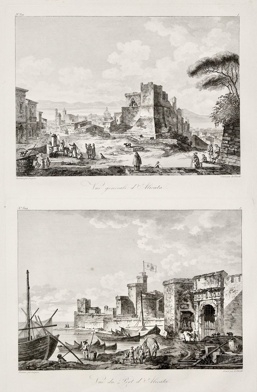 Coppia di incisioni in rame di De Ghendt, ognuna ca. 145x220. Tratta da“Voyage Pittoresque ou description des Royaumes de Naples et de Sicile”, in assoluto una delle più belle ed eleganti opere descrittive del regno di Napoli: composta da cinque volumi usciti dal 1781 al 1786, rappresentò un enorme sforzo economico e tipografico, ripagato peraltro da un successo enorme di vendite, diventando il modello tipografico su cui si basarono molte posteriori opere di viaggio. Bell’esemplare con ampi margini.