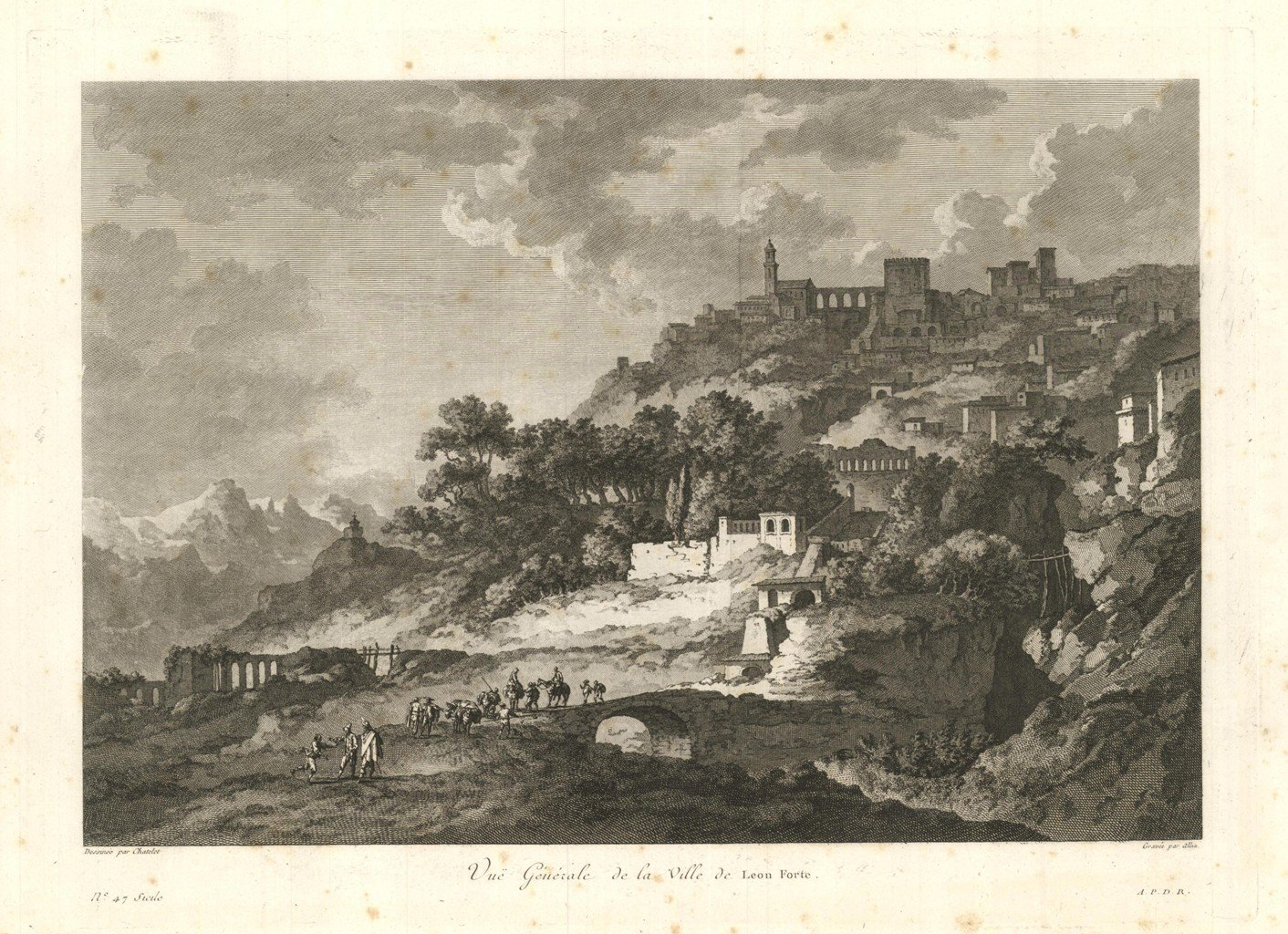 Veduta del paese presa ai piedi della montagna.Tratta dalla prima edizione della monumentale opera edita da Jean-Claude Richard de Saint-Non, meglio noto come Abate di Saint-Non " Voyage ou Description des Royaumes de Naples et de Sicilie ". Pubblicata a Parigi dal 1781 al 1786.