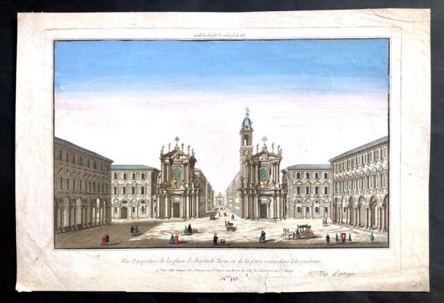 Paris, 1770 circa. Incisione in rame all'acquaforte, colore d'epoca, cm 33 x 48,5 circa (il foglio). Rara veduta ottica e prospettica della seicentesca Piazza San Carlo in Torino, al centro le due chiese gemelle di Santa Cristina e San Carlo, con le loro facciate barocche eseguite su progetto dello Juvarra, e con Porta Nuova sullo sfondo; scena animata da piccole figure in costume settecentesco. L' immagine, pur con alcune varianti, riproduce una veduta facente parte di uno dei più bei libri di feste del Settecento italiano “La sontuosa illuminazione della città di Torino”, che venne pubblicato nel 1737 a Torino, per i tipi di G. B. Chais, in occasione delle nozze fra Carlo Emanuele III re di Sardegna ed Elisabetta Teresa di Lorena. In tenue coloritura e in margini, un breve strappo rimarginato al margine inferiore tocca il sottotitolo, buono lo stato di conservazione. .