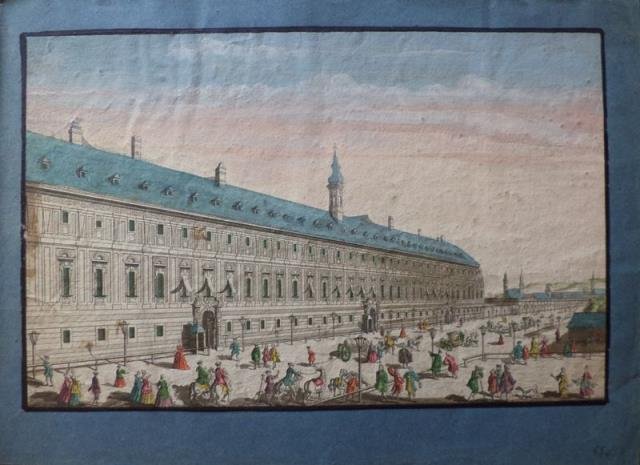 Paris, 1770 circa. Incisione in rame all'acquaforte, colore d'epoca, cm 26 x 40,5 circa (il foglio). Veduta ottica in tenue coloritura. Margini rifilati, alcuni difetti, discreta conservazione.