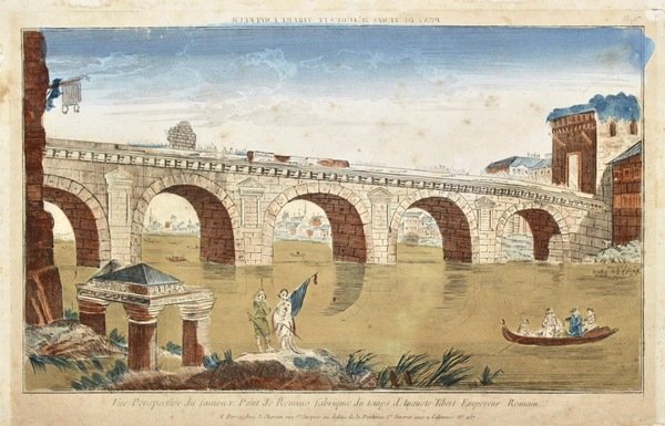 Vue perspective du fameux Pont de Remino fabriquée du temps d'Auguste Tiberi empereur romani.