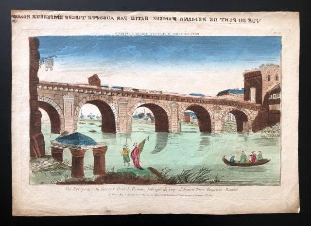 Paris, Chereau, 1770 circa. Incisione in rame all’acquaforte in colore d’epoca, cm 27 x 40 (alla lastra) più margini. Veduta ottica animata del ponte di Rimini, non comune. Bella coloritura, buono stato.
