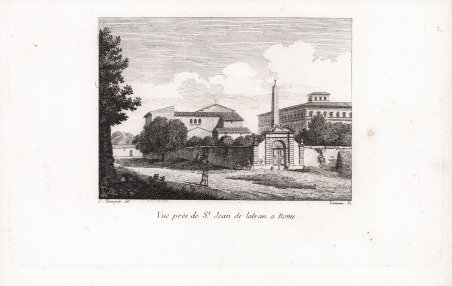 Veduta tratta dal ' Recueil de Vues et fabriques pittoresques d'Italie, Dessinées d'apres Nature, Et publiées par C. Bourgeois, Peintre. Questo album di incisioni tratte da disegni di Florent Constant Bourgeois, incisi da Guyot e Lameau, comprende per la maggior parte vedute di Roma e dei suoi dintorni (Tivoli, Marino, Subiaco, Montecassino, Anagni, Grottaferrata, Frascati, Genzano, Castel Gandolfo, ecc.), ma anche di Firenze, Pisa, Siena, Genova, Caserta e Napoli. L’opera, il cui frontespizio non fu mai stampato, uscì a dispense come raccolta di stampe e fu edita dallo stesso Bourgeois a Parigi, con indirizzo ' Mousé des Artistes, rue de Sorbonne. Incisione in rame, impressa su carta vergata coeva, piccole ossidazioni, per il resto in buone condizioni. Florent-Constant Bourgeois, detto “Bourgeois du Castelet” era originariamente un ufficiale militare. Bourgeois si dedicò esclusivamente all'arte a partire dalla metà degli anni '90, perfezionando la sua formazione nello studio di Jacques-Louis David, dove si specializzò in paesaggi e divenne soprattutto uno straordinario disegnatore; Paul Marmottan, nella sua "Ecole française de peinture, 1789-1830", fa riferimento alla sua " ' grande pureté de style et l’exécution brillante de ses dessins, la plupart très remarquables, notamment ceux au lavis". Molto ricercato e apprezzato durante la sua vita, Bourgeois ha ricevuto numerosi premi e riconoscimenti artistici, una casa al Louvre e la Legion d'onore nel 1827. Viveva al numero 3 di quai Malaquais a Parigi. La sua attività di pittore è oggi meno conosciuta, eppure espose quadri in quasi tutti i Salon dal 1791 al 1830, con solo vedute dell'Italia per il periodo dalla Rivoluzione al Consolato. Bibliografia Brunet I, 1178; Cohen I, 183; Graesse, I 512. View taken from the ' Recueil de Vues et fabriques pittoresques d'Italie, Dessinées d'apres Nature, Et publiées par C. Bourgeois, Peintre. This album of engravings taken from drawings by Florent Constant Bourgeois, engraved by Guyot and Lameau, includes mostly views of Rome and its environs (Tivoli, Marino, Subiaco, Montecassino, Anagni, Grottaferrata, Frascati, Genzano, Castel Gandolfo, etc.), but also of Florence, Pisa, Siena, Genoa, Caserta and Naples. The work, whose frontispiece was never printed, came out in handouts as a collection of prints and was edited by Bourgeois himself in Paris, with address ' Mousé des Artistes, rue de Sorbonne. Florent-Constant Bourgeois, known as "Bourgeois du Castelet," was originally a military officer. Bourgeois devoted himself exclusively to art from the mid-1790s, perfecting his training in Jacques-Louis David's studio, where he specialized in landscapes and became above all an extraordinary draughtsman; Paul Marmottan, in his "Ecole française de peinture, 1789-1830," refers to his " grande pureté de style et l'exécution brillante de ses dessins, la plupart très remarquables, notamment ceux au lavis." Highly sought after and appreciated during his lifetime, Bourgeois received numerous artistic prizes and awards, a house in the Louvre, and the Legion of Honor in 1827. He lived at No. 3 quai Malaquais in Paris. His activity as a painter is less well known today, yet he exhibited paintings in almost every Salon from 1791 to 1830, with only views of Italy for the period from the Revolution to the Consulate. Copperplate engraving, impressed on contemporary laid paper, minor oxidation, otherwise in good condition. Bibliografia Brunet I 1178. Cfr.