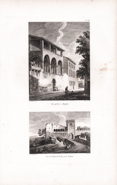 Coppia di vedute tratta dal ' Recueil de Vues et fabriques pittoresques d'Italie, Dessinées d'apres Nature, Et publiées par C. Bourgeois, Peintre. Questo album di incisioni tratte da disegni di Florent Constant Bourgeois, incisi da Guyot e Lameau, comprende per la maggior parte vedute di Roma e dei suoi dintorni (Tivoli, Marino, Subiaco, Montecassino, Anagni, Grottaferrata, Frascati, Genzano, Castel Gandolfo, ecc.), ma anche di Firenze, Pisa, Siena, Genova, Caserta e Napoli. L’opera, il cui frontespizio non fu mai stampato, uscì a dispense come raccolta di stampe e fu edita dallo stesso Bourgeois a Parigi, con indirizzo ' Mousé des Artistes, rue de Sorbonne. Incisione in rame, impressa su carta vergata coeva, piccole ossidazioni, per il resto in buone condizioni. Florent-Constant Bourgeois, detto “Bourgeois du Castelet” era originariamente un ufficiale militare. Bourgeois si dedicò esclusivamente all'arte a partire dalla metà degli anni '90, perfezionando la sua formazione nello studio di Jacques-Louis David, dove si specializzò in paesaggi e divenne soprattutto uno straordinario disegnatore; Paul Marmottan, nella sua "Ecole française de peinture, 1789-1830", fa riferimento alla sua " ' grande pureté de style et l’exécution brillante de ses dessins, la plupart très remarquables, notamment ceux au lavis". Molto ricercato e apprezzato durante la sua vita, Bourgeois ha ricevuto numerosi premi e riconoscimenti artistici, una casa al Louvre e la Legion d'onore nel 1827. Viveva al numero 3 di quai Malaquais a Parigi. La sua attività di pittore è oggi meno conosciuta, eppure espose quadri in quasi tutti i Salon dal 1791 al 1830, con solo vedute dell'Italia per il periodo dalla Rivoluzione al Consolato. Bibliografia Brunet I, 1178; Cohen I, 183; Graesse, I 512. Couple of views taken from the ' Recueil de Vues et fabriques pittoresques d'Italie, Dessinées d'apres Nature, Et publiées par C. Bourgeois, Peintre. This album of engravings taken from drawings by Florent Constant Bourgeois, engraved by Guyot and Lameau, includes mostly views of Rome and its environs (Tivoli, Marino, Subiaco, Montecassino, Anagni, Grottaferrata, Frascati, Genzano, Castel Gandolfo, etc.), but also of Florence, Pisa, Siena, Genoa, Caserta and Naples. The work, whose frontispiece was never printed, came out in handouts as a collection of prints and was edited by Bourgeois himself in Paris, with address ' Mousé des Artistes, rue de Sorbonne. Florent-Constant Bourgeois, known as "Bourgeois du Castelet," was originally a military officer. Bourgeois devoted himself exclusively to art from the mid-1790s, perfecting his training in Jacques-Louis David's studio, where he specialized in landscapes and became above all an extraordinary draughtsman; Paul Marmottan, in his "Ecole française de peinture, 1789-1830," refers to his " grande pureté de style et l'exécution brillante de ses dessins, la plupart très remarquables, notamment ceux au lavis." Highly sought after and appreciated during his lifetime, Bourgeois received numerous artistic prizes and awards, a house in the Louvre, and the Legion of Honor in 1827. He lived at No. 3 quai Malaquais in Paris. His activity as a painter is less well known today, yet he exhibited paintings in almost every Salon from 1791 to 1830, with only views of Italy for the period from the Revolution to the Consulate. Copperplate engraving, impressed on contemporary laid paper, minor oxidation, otherwise in good condition. Bibliografia Brunet I 1178. Cfr.
