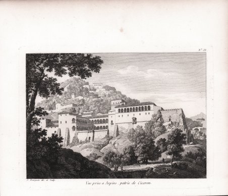 Veduta tratta dal ' Recueil de Vues et fabriques pittoresques d'Italie, Dessinées d'apres Nature, Et publiées par C. Bourgeois, Peintre. Questo album di incisioni tratte da disegni di Florent Constant Bourgeois, incisi da Guyot e Lameau, comprende per la maggior parte vedute di Roma e dei suoi dintorni (Tivoli, Marino, Subiaco, Montecassino, Anagni, Grottaferrata, Frascati, Genzano, Castel Gandolfo, ecc.), ma anche di Firenze, Pisa, Siena, Genova, Caserta e Napoli. L’opera, il cui frontespizio non fu mai stampato, uscì a dispense come raccolta di stampe e fu edita dallo stesso Bourgeois a Parigi, con indirizzo ' Mousé des Artistes, rue de Sorbonne. Incisione in rame, impressa su carta vergata coeva, piccole ossidazioni, per il resto in buone condizioni. Florent-Constant Bourgeois, detto “Bourgeois du Castelet” era originariamente un ufficiale militare. Bourgeois si dedicò esclusivamente all'arte a partire dalla metà degli anni '90, perfezionando la sua formazione nello studio di Jacques-Louis David, dove si specializzò in paesaggi e divenne soprattutto uno straordinario disegnatore; Paul Marmottan, nella sua "Ecole française de peinture, 1789-1830", fa riferimento alla sua " ' grande pureté de style et l’exécution brillante de ses dessins, la plupart très remarquables, notamment ceux au lavis". Molto ricercato e apprezzato durante la sua vita, Bourgeois ha ricevuto numerosi premi e riconoscimenti artistici, una casa al Louvre e la Legion d'onore nel 1827. Viveva al numero 3 di quai Malaquais a Parigi. La sua attività di pittore è oggi meno conosciuta, eppure espose quadri in quasi tutti i Salon dal 1791 al 1830, con solo vedute dell'Italia per il periodo dalla Rivoluzione al Consolato. Bibliografia Brunet I, 1178; Cohen I, 183; Graesse, I 512. View taken from the ' Recueil de Vues et fabriques pittoresques d'Italie, Dessinées d'apres Nature, Et publiées par C. Bourgeois, Peintre. This album of engravings taken from drawings by Florent Constant Bourgeois, engraved by Guyot and Lameau, includes mostly views of Rome and its environs (Tivoli, Marino, Subiaco, Montecassino, Anagni, Grottaferrata, Frascati, Genzano, Castel Gandolfo, etc.), but also of Florence, Pisa, Siena, Genoa, Caserta and Naples. The work, whose frontispiece was never printed, came out in handouts as a collection of prints and was edited by Bourgeois himself in Paris, with address ' Mousé des Artistes, rue de Sorbonne. Florent-Constant Bourgeois, known as "Bourgeois du Castelet," was originally a military officer. Bourgeois devoted himself exclusively to art from the mid-1790s, perfecting his training in Jacques-Louis David's studio, where he specialized in landscapes and became above all an extraordinary draughtsman; Paul Marmottan, in his "Ecole française de peinture, 1789-1830," refers to his " grande pureté de style et l'exécution brillante de ses dessins, la plupart très remarquables, notamment ceux au lavis." Highly sought after and appreciated during his lifetime, Bourgeois received numerous artistic prizes and awards, a house in the Louvre, and the Legion of Honor in 1827. He lived at No. 3 quai Malaquais in Paris. His activity as a painter is less well known today, yet he exhibited paintings in almost every Salon from 1791 to 1830, with only views of Italy for the period from the Revolution to the Consulate. Copperplate engraving, impressed on contemporary laid paper, minor oxidation, otherwise in good condition. Bibliografia Brunet I 1178. Cfr.