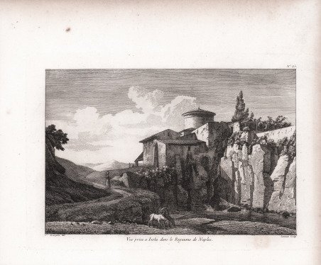 Veduta tratta dal ' Recueil de Vues et fabriques pittoresques d'Italie, Dessinées d'apres Nature, Et publiées par C. Bourgeois, Peintre. Questo album di incisioni tratte da disegni di Florent Constant Bourgeois, incisi da Guyot e Lameau, comprende per la maggior parte vedute di Roma e dei suoi dintorni (Tivoli, Marino, Subiaco, Montecassino, Anagni, Grottaferrata, Frascati, Genzano, Castel Gandolfo, ecc.), ma anche di Firenze, Pisa, Siena, Genova, Caserta e Napoli. L’opera, il cui frontespizio non fu mai stampato, uscì a dispense come raccolta di stampe e fu edita dallo stesso Bourgeois a Parigi, con indirizzo ' Mousé des Artistes, rue de Sorbonne. Incisione in rame, impressa su carta vergata coeva, piccole ossidazioni, per il resto in buone condizioni. Florent-Constant Bourgeois, detto “Bourgeois du Castelet” era originariamente un ufficiale militare. Bourgeois si dedicò esclusivamente all'arte a partire dalla metà degli anni '90, perfezionando la sua formazione nello studio di Jacques-Louis David, dove si specializzò in paesaggi e divenne soprattutto uno straordinario disegnatore; Paul Marmottan, nella sua "Ecole française de peinture, 1789-1830", fa riferimento alla sua " ' grande pureté de style et l’exécution brillante de ses dessins, la plupart très remarquables, notamment ceux au lavis". Molto ricercato e apprezzato durante la sua vita, Bourgeois ha ricevuto numerosi premi e riconoscimenti artistici, una casa al Louvre e la Legion d'onore nel 1827. Viveva al numero 3 di quai Malaquais a Parigi. La sua attività di pittore è oggi meno conosciuta, eppure espose quadri in quasi tutti i Salon dal 1791 al 1830, con solo vedute dell'Italia per il periodo dalla Rivoluzione al Consolato. Bibliografia Brunet I, 1178; Cohen I, 183; Graesse, I 512. View taken from the ' Recueil de Vues et fabriques pittoresques d'Italie, Dessinées d'apres Nature, Et publiées par C. Bourgeois, Peintre. This album of engravings taken from drawings by Florent Constant Bourgeois, engraved by Guyot and Lameau, includes mostly views of Rome and its environs (Tivoli, Marino, Subiaco, Montecassino, Anagni, Grottaferrata, Frascati, Genzano, Castel Gandolfo, etc.), but also of Florence, Pisa, Siena, Genoa, Caserta and Naples. The work, whose frontispiece was never printed, came out in handouts as a collection of prints and was edited by Bourgeois himself in Paris, with address ' Mousé des Artistes, rue de Sorbonne. Florent-Constant Bourgeois, known as "Bourgeois du Castelet," was originally a military officer. Bourgeois devoted himself exclusively to art from the mid-1790s, perfecting his training in Jacques-Louis David's studio, where he specialized in landscapes and became above all an extraordinary draughtsman; Paul Marmottan, in his "Ecole française de peinture, 1789-1830," refers to his " grande pureté de style et l'exécution brillante de ses dessins, la plupart très remarquables, notamment ceux au lavis." Highly sought after and appreciated during his lifetime, Bourgeois received numerous artistic prizes and awards, a house in the Louvre, and the Legion of Honor in 1827. He lived at No. 3 quai Malaquais in Paris. His activity as a painter is less well known today, yet he exhibited paintings in almost every Salon from 1791 to 1830, with only views of Italy for the period from the Revolution to the Consulate. Copperplate engraving, impressed on contemporary laid paper, minor oxidation, otherwise in good condition. Bibliografia Brunet I 1178. Cfr.