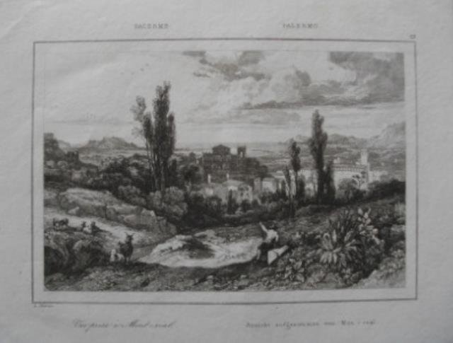 Seconda meta' dell' '800. Dalla "Italie Pittoresque", incisione su rame, b/n, cm 13,5 x 20,5 (il foglio). Piccola veduta di Monreale presso Palermo.