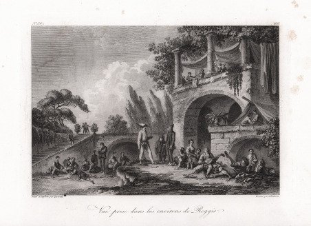Veduta pubblicata nel ' Voyage Pittoresque ou description des Royaumes de Naples et de Sicile, opera in 5 volumi per la prima volta stampati a Parigi tra 1781 e il 1786. Richard de Saint-Non conobbe, durante il suo viaggio a Roma, i due già celebri pittori francesi Jean Honoré Fragonard e Hubert Robert, con i quali prosegue il suo viaggio per tutto il paese. Da questa grande amicizia nasce l’idea e la collaborazione per l’ambizioso progetto di documentare graficamente tutti i principali monumenti dell’Italia Meridionale e della Sicilia. Da qui, tra il 1781 ed il 1786, con l’aiuto di numerosi ed importanti architetti, pittori ed incisori, venne alla luce il ' Voyage Pittoresque ou description des Royaume de Naples et de Sicilie, opera composta di cinque volumi che uscirono annualmente. Incredibile sforzo tipografico, l’opera raccoglie quasi per intero gli appunti di viaggio del Saint-Non, adeguatamente assemblati e corretti; il corpus grafico è composto di ben 542 incisioni all’acquaforte e bulino, opera dei principali artisti di riproduzione del periodo. Da un punto di vista editoriale l’iniziativa riscuote immediatamente un grandissimo successo: il libro diviene un vero e proprio modello tipografico, sul quale sono basate diverse pubblicazioni dell’impero napoleonico. Dal punto di vista artistico le vedute, i paesaggi e le rovine conservano, e non può essere altrimenti, lo stile pittorico e romantico del Fragonard, del Robert, del Desprez, e di tutti gli altri artisti che collaborano nella realizzazione di questa monumentale opera. Il notevole successo commerciale della raccolta è testimoniato dalla ristampa, tra il 1795 ed il 1798, delle sole tavole pittoriche. Un’ulteriore edizione è stampata nel 1829 dal Dufour. Esemplare tratto dal ' Voyage Pittoresque, ' seconda edizione del 1795/98, priva dell’indicazione del privilegio reale. ' Acquaforte, stampata su carta vergata coeva, leggere ossidazioni, per il resto in ottimo stato di conservazione. View taken from the ' Voyage Pittoresque ou description des Royaume de Naples et de Sicilie ' by Richard de Saint-Non. During his trip to Rome, Richard de Saint-Non met two already famous French painters, Jean Honoré Fragonard and Hubert Robert, with whom he travelled along Italy. Their friendship led to the cooperation for the ambitious project of depicting all the main monuments of Southern Italy and Sicily. Between 1781 and 1786, with the assistance of many contemporary artists, he realized the ' Voyage Pittoresque ou description des Royaume de Naples et de Sicilie, a five volumes work published annually. As a result of a great typographical effort, the work is a collection of Sain-Non’s travelling notes; the graphic part is made up of 542 engravings and etchings, realized by the most important artists of the period. The work is immediately successful, for the book became a new typographical model for the following publications. From an artistic point of view, the views, landscapes and antiquity keep the Romantic pictorial style of Fragonard, Robert, Desprez and all the other artists that took part in this monumental project. The re-issue, between 1795 and 1798, of the pictorial plates, witnesses the great success of this project. A re-issue of the whole work was edited in 1829 by Dufour. Example taken from the second edition of the work, printed in Paris 1795/98; the plates are without the Royal priviledge. ' Etching, printed on contemporary laid paper, light foxing, otherwise good condition. Cfr.