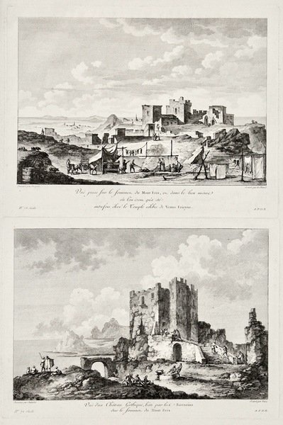 Coppia di incisioni in rame di De Ghendt e Paris, ognuna ca. mm 145x220. Tratta da“Voyage Pittoresque ou description des Royaumes de Naples et de Sicile”, in assoluto una delle più belle ed eleganti opere descrittive del regno di Napoli: composta da cinque volumi usciti dal 1781 al 1786, rappresentò un enorme sforzo economico e tipografico, ripagato peraltro da un successo enorme di vendite, diventando il modello tipografico su cui si basarono molte posteriori opere di viaggio. Bell’esemplare con ampi margini.