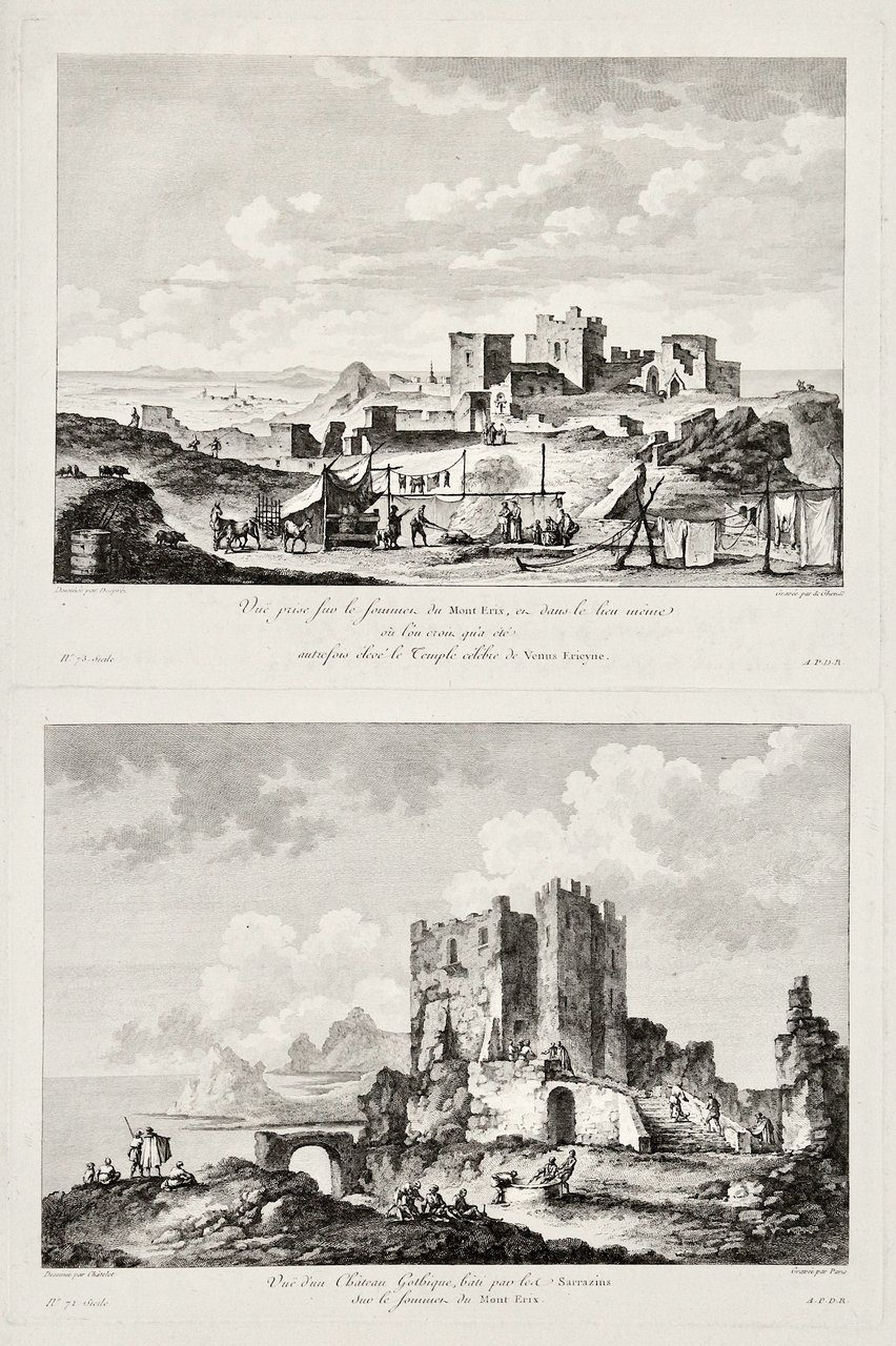 Vue prise sur le sommes du Mont Erix, le Temple célèbre de Venus Erieyne. (Insieme a:) Vue d‘un Chateau Gothique, bati par les Sarrazins sur le sommet du Mont Erix.
