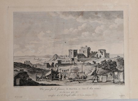 Veduta pubblicata nel ' Voyage Pittoresque ou description des Royaumes de Naples et de Sicile, opera in 5 volumi per la prima volta stampati a Parigi tra 1781 e il 1786. Richard de Saint-Non conobbe, durante il suo viaggio a Roma, i due già celebri pittori francesi Jean Honoré Fragonard e Hubert Robert, con i quali prosegue il suo viaggio per tutto il paese. Da questa grande amicizia nasce l’idea e la collaborazione per l’ambizioso progetto di documentare graficamente tutti i principali monumenti dell’Italia Meridionale e della Sicilia. Da qui, tra il 1781 ed il 1786, con l’aiuto di numerosi ed importanti architetti, pittori ed incisori, venne alla luce il Voyage Pittoresque ou description des Royaume de Naples et de Sicilie, opera composta di cinque volumi che uscirono annualmente. Incredibile sforzo tipografico, l’opera raccoglie quasi per intero gli appunti di viaggio del Saint-Non, adeguatamente assemblati e corretti; il corpus grafico è composto di ben 542 incisioni all’acquaforte e bulino, opera dei principali artisti di riproduzione del periodo. Da un punto di vista editoriale l’iniziativa riscuote immediatamente un grandissimo successo: il libro diviene un vero e proprio modello tipografico, sul quale sono basate diverse pubblicazioni dell’impero napoleonico. Dal punto di vista artistico le vedute, i paesaggi e le rovine conservano, e non può essere altrimenti, lo stile pittorico e romantico del Fragonard, del Robert, del Desprez, e di tutti gli altri artisti che collaborano nella realizzazione di questa monumentale opera. Il notevole successo commerciale della raccolta è testimoniato dalla ristampa, tra il 1795 ed il 1798, delle sole tavole pittoriche. Un’ulteriore edizione è stampata nel 1829 dal Dufour. Esemplare tratto dal ' Voyage Pittoresque, ' seconda edizione del 1795/98, priva dell’indicazione del privilegio reale. ' Acquaforte, stampata su carta vergata coeva, leggere ossidazioni, per il resto in ottimo stato di conservazione. View taken from the Voyage Pittoresque ou description des Royaume de Naples et de Sicilie by Richard de Saint-Non. During his trip to Rome, Richard de Saint-Non met two already famous French painters, Jean Honoré Fragonard and Hubert Robert, with whom he travelled along Italy. Their friendship led to the cooperation for the ambitious project of depicting all the main monuments of Southern Italy and Sicily. Between 1781 and 1786, with the assistance of many contemporary artists, he realized the Voyage Pittoresque ou description des Royaume de Naples et de Sicilie, a five volumes work published annually. As a result of a great typographical effort, the work is a collection of Sain-Non’s travelling notes; the graphic part is made up of 542 engravings and etchings, realized by the most important artists of the period. The work is immediately successful, for the book became a new typographical model for the following publications. From an artistic point of view, the views, landscapes and antiquity keep the Romantic pictorial style of Fragonard, Robert, Desprez and all the other artists that took part in this monumental project. The re-issue, between 1795 and 1798, of the pictorial plates, witnesses the great success of this project. A re-issue of the whole work was edited in 1829 by Dufour. Example taken from the second edition of the work, printed in Paris 1795/98; the plates are without the Royal priviledge. ' Etching, printed on contemporary laid paper, light foxing, otherwise good condition. Cfr. Cremonini pp. 119/129, 73.
