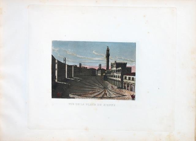 Senza indicazioni tipografiche, 1830 circa. Tratte da un anonimo album che reca il titolo "Vues de l'Italie" (e che raccoglie altre vedute relative a Firenze, Pisa e Livorno), numero 02 vedute della città di Siena, realizzate all'acquatinta in manuale coloritura coeva, cm 20 x 23 circa (alla lastra), cm 22,5 x 31,5 (il foglio). Minime comparse di fioriture marginali, belle le coloriture, buono lo stato di conservazione di entrambe.