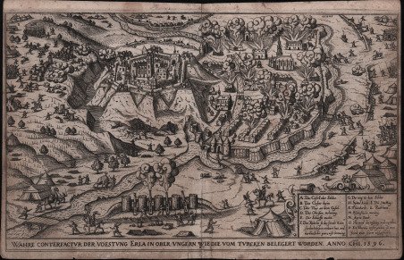 Veduta dell'assedio di Eger ' di Hieronymus Ortelius e Johann Sibmacher, tratta dalla ' Chronologia oder historische Beschreibung aller Kriegsempörungen unnd Belägerungen der Stätt und Vestungen auch Scharmützeln und Schlachten so in Ober und Unter Ungern auch Siebenbürgen mit dem Turcken von Ao. 1395 biss auff gegenwertige Zeit denckhwürtig geschehen. Norimberga, Christoff Lochner per Johann Sibmacher, 1604. Importante opera storica sulla storia militare della regione austro-ungarica, inclusa la Transilvania, durante gli anni 1395 -1612, che descrive tutte le guerre, gli assedi di città e fortezze, le battaglie con i turchi e altri eventi degni di nota in Ungheria, scritta e assiduamente registrata da Hieronymus Ortelius o Oertel (1543-1614). "Una descrizione di tutte le battaglie che ebbero luogo in Ungheria e Transilvania durante le guerre con i Turchi dal 1390 al 1602" (Atabey), particolarmente preziosa per le sue vedute delle città ungheresi sotto assedio o in battaglia e i ritratti dei comandanti militari. L'autore, notaio alla corte imperiale, fu incoraggiato a scrivere l'opera da suo cognato, Johann Sibmacher, incisore ed editore di Norimberga, responsabile anche delle tavole incise: "uno storico che difendeva i diritti dei protestanti minacciati dall'imperatore Rodolfo II, si rifugiò a Norimberga dove pubblicò questa storia dell'Ungheria" (Atabey). Niente di simile era mai stato stampato prima. Specialmente il periodo 1592-1612 è trattato in modo molto dettagliato, dato che l'autore ha incluso rapporti di testimoni oculari sulle invasioni turche nella regione. Le 30 tavole a doppia pagina mostrano gli assedi e le fortificazioni delle seguenti città: Vienna, Zolnoch, Tocaky, Guyla, Zigeth, Sysegk, Palotta, Villeck, Raab, Comorra, Gran, Vizzegrad, Tergovist, Temeswar, Hatwan, Petrina, Tottis, Papa, Waitzen, Budapest, Tolna, Stulweisenburg e Canisha. Le città furono assediate dai turchi o le città turche dai cristiani. Incisione in rame, stampata su carta vergata contemporanea, irregolarmente rifilata al bordo, ossidazione uniforme e qualche macchia, altrimenti buono stato di conservazione. Rara. Bibliografia Leonora Navari ' The Ottoman world. The Sefik E. Atabey Collection. Books, manuscripts and maps., n. 882. Siege-view ' of Eger by Hieronymus Ortelius and Johann Sibmacher taken from the ' Chronologia oder historische Beschreibung aller Kriegsempörungen unnd Belägerungen der Stätt und Vestungen auch Scharmützeln und Schlachten so in Ober und Unter Ungern auch Siebenbürgen mit dem Turcken von Ao. 1395 biss auff gegenwertige Zeit denckhwürtig geschehen. Nuremberg, Christoff Lochner for Johann Sibmacher, 1604. Important historical work on the military history of the Austro-Hungarian region, including Transylvania, during the years 1395 -1612, describing all the wars, sieges of cities and fortresses, battles with the Turks and other noteworthy events in Hungary, written and assiduously recorded by Hieronymus Ortelius or Oertel (1543-1614). "A description of all the battles which took place in Hungary and Transylvania during the wars with the Turks from 1390 to 1602" (Atabey), especially valuable for its views of Hungarian towns under siege or battle and the portraits of military commanders. The author, a notary at the imperial court, was encouraged to write the work by his brother-in-law, Johann Sibmacher, a Nuremberg engraver and publisher, who was also responsible for the engraved plates: "a historian who defended the rights of Protestants threatened by the emperor Rudolph II, took refuge in Nuremberg where he published this history of Hungary" (Atabey). Cfr.