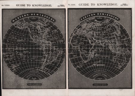 Mappa del mondo in due emisferi tratta da The Guide to Knowledge di William Pinnock, pubblicata a Londra a partire dal 1833. William Pinnock (1782 - 1843) è stato un editore e scrittore educativo britannico. Inizialmente commerciava nella città natale di Alton, nell'Hampshire; trasferì l'attività a Newbury, nel Berkshire, nel 1811 e a Londra nel 1817, quando acquistò i locali della Literary Gazette al 267 di Strand in società con Samuel Maunder. Litografia, ottime condizioni. Rara. Map of the world in two hemispheres from The Guide to Knowledge by William Pinnock, published in London from 1833. William Pinnock (3 February 1782 in Alton, Hampshire – 21 October 1843 in London) was a British publisher and educational writer. Orginally trading in hometown Alton, Hampshire; moved business to Newbury, Berkshire 1811 and to London in 1817 when bought premises of the Literary Gazette at 267 Strand in partnership with Samuel Maunder. Lithograph, very good condition. Rare. Cfr.