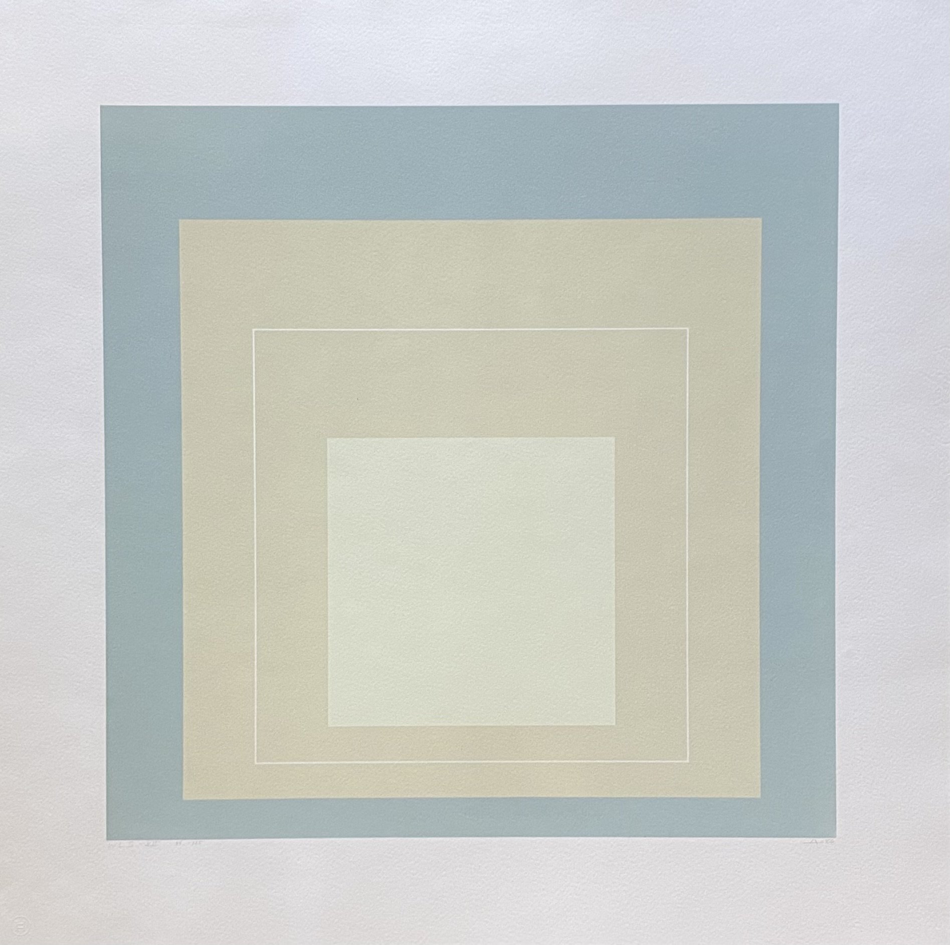 Il foglio appartiene alla serie di 8 tavole dal titolo: White line square (series I). Tavola n 7. Esemplare firmato a matita: A '66, intitolato: WLS-VII e numerato: 46 - 125. Nell'angolo in basso a sinistra timbro a secco dell'editore Gemini G.E.L. di Los Angeles con il numero a matita 1158. Gemini G.E.L. è una stampatore ed editore di incisioni e sculture in tiratura limitata fondato da Sidney B. Felsen, Stanley Grinstein (1927-2014) e Kenneth Tyler nel 1966. La tiratura complessiva è di 125 + 15 prove d'artista. Filigrana: Arches. Impressione eccellente in ottimo stato di conservazione. Foglio intonso.