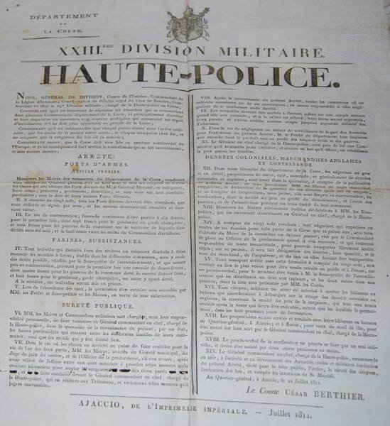 XIII.ème DIVISION MILITAIRE. HAUTE POLICE. - Département de la Corse.