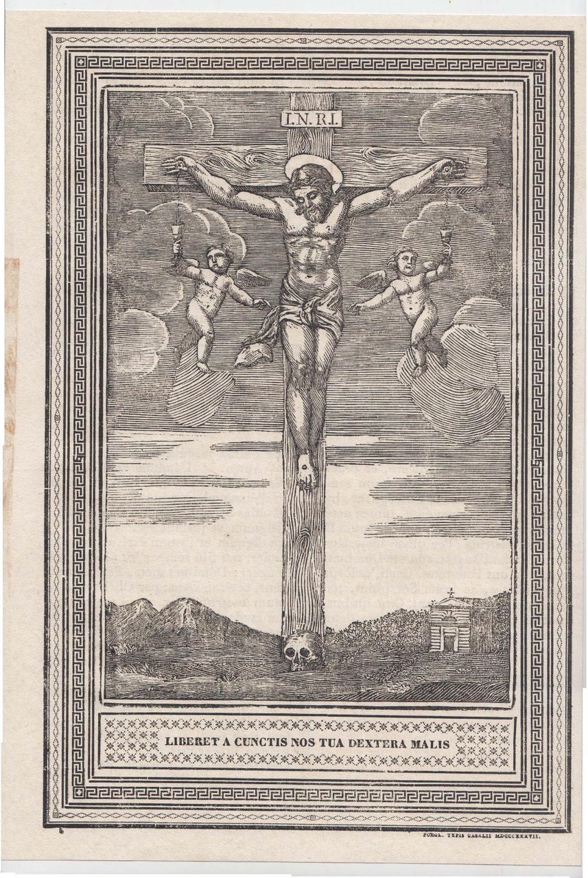 Xilografia Crocifissione di Gesù Cristo , iscrizione in basso Liberet a cunctis nos tua dextera malis, stampatore Forol. Typis Casalii 1837,