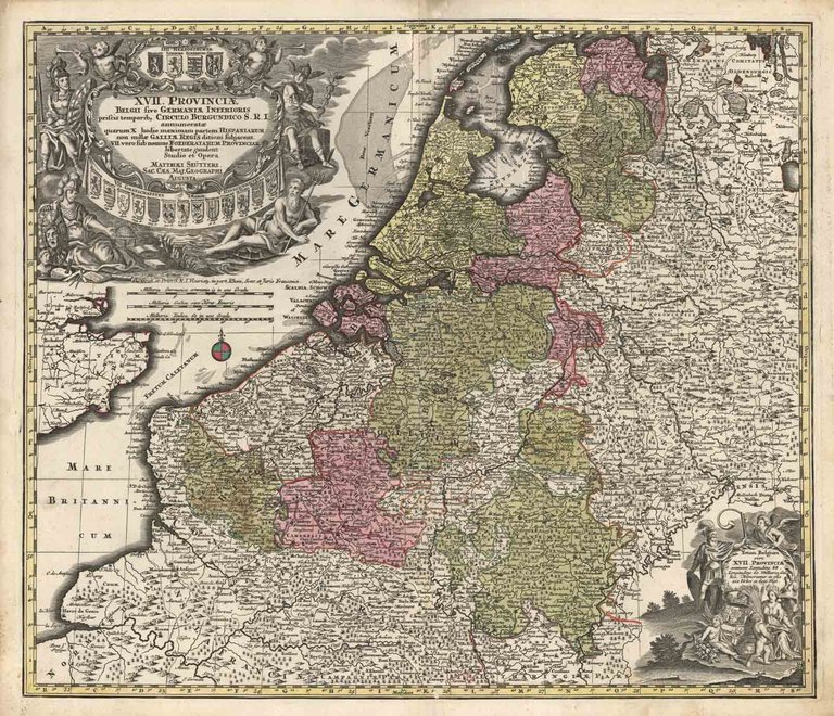 Carta geografica raffigurante i territori delle Diciassette Province corrispondenti agli attuali territori dei Paesi Bassi, Belgio e Lussemburgo. Nell'angolo in alto a sinistra il titolo si trova iscritto in un decorativo ed animato cartiglio inciso su disegno di G. Rogg. Sotto, in campo libero, sono riportate le scale grafiche. Nell'angolo in basso a destra sono riportate la longitudine e latitudine delle Diciassette Province. La carta è caratterizzata da vivace coloritura coeva all'acquerello. Piega centrale editoriale. Ottimo stato di conservazione