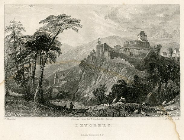 Incisione su acciaio di dimensioni 10x15 cm. Condizioni : USATO - Stato : Buono, ordinari segni d'uso e del tempo. Gora d'acqua nella parte inferiore centrale. Altre note : Veduta di castel Zeno o Zenoburg a Merano, in Val Passiria. Il castello si erge in altezza sulla destra, mentre sulla sinistra nel primo piano gli fanno da contrappunto due alti alberi. Sempre nel primo piano una scena bucolica sulle rive del Passirio. La stampa si trova probabilmente in "Views in the Tyrol from drawings by T. Allom after original sketches by Johanna v. Isser geb. Grossrubatscher".