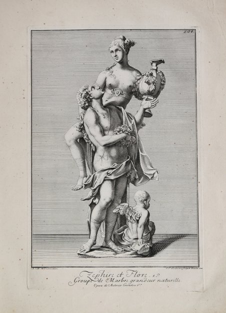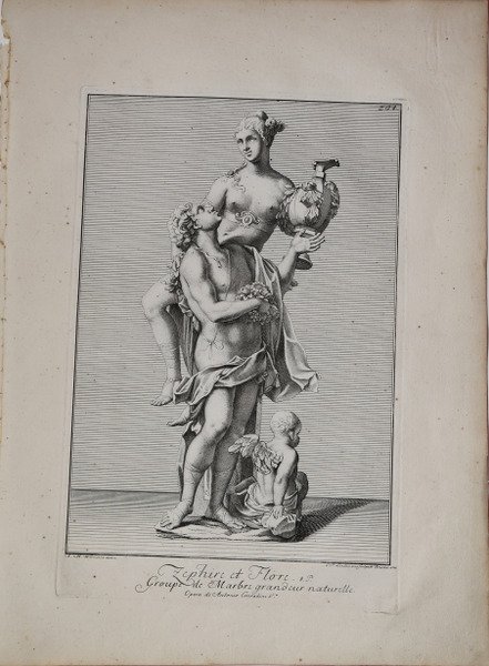 Opera tratta da ' Recueil des marbres antiques qui se trouvent dans la Galerie du Roy de Pologne à Dresden avec privilege du roy, l'année 1733, pubblicata da Raymond Leplat a Dresda nel 1735. Il catalogo raccoglie, in 230 tavole, la Galleria scultorea, antica e moderna, e altri oggetti artistici posseduti dall’elettore di Sassonia, Federico Augusto I detto Augusto il Forte, morto proprio nel 1733. Il re aveva acquistato arte antica da Federico Guglielmo I di Prussia (compresa la collezione dei ritratti romani di Bellori) e dalle famiglie Chigi e Albani di Roma (sculture, vasi, bronzi e mummie).Sebbene il frontespizio rechi la data del 1733, le tavole recano date anche successive. (1734-1735). Manca un apparato di commento che indichi le provenienze dei pezzi e la maggior parte delle tavole recano solo una breve denominazione dei soggetti, prevalentemente mitologici, raffigurati.Quasi tutte le tavole sono firmate dagli disegnatori e dagli incisori. I disegnatori sono A.M. Wernerin, J. Preissler, M. Tuscher e H. Preissler. Gli incisori L. Zucchi, C.F. Boetius, G. Mart. Preissler, Johann Balthasar Probst, Bernigeroth, Johann David Hertz, Iac. Gottlieb Thelot, Iac. Andr. Fridrich, Christian Philipp Lindemann, Hieronymus Sperling, “MB”, Joh. Jac. Steltzer o Chr. Raym. Thoman.Acquaforte, in ottimo stato di conservazione. Recueil des marbres antiques qui se trouvent dans la ' Galerie du Roy de Pologne à Dresden, published in Dresden by Raymond Le Plat, in 1735.The collection of ancient and modern art at Dresden had been established by Friedrich August I ('Augustus the Strong'), who died in the same year as this book was published. He had bought antiquities from Frederick William I of Prussia (including the Bellori collection of Roman portraits) and from the Chigi and Albani families of Rome (including sculpture, vases, bronzes and mummies). Several Roman antiquities had arrived in Dresden as recently as 1729.The plates have no accompanying explanatory texts, but most are captioned. Subjects are chiefly mythological (the collection includes copies of some famous works, such as Praxiteles's 'Satyr' and Scopas's 'Maenad tearing a goat').Almost all the plates are signed by draughtsmen and engravers. The draughtsmen were A.M. Wernerin, Joh. Justin Preissler, M. Tuscher or H. Preissler. The engravers were Lorenzo Zucchi, C.F. Boetius, Georg Mart. Preissler, Johann Balthasar Probst, Bernigeroth, Johann David Hertz, Iac. Gottlieb Thelot, Iac. Andr. Fridrich, Christian Philipp Lindemann, Hieronymus Sperling, 'MB', Joh. Jac. Steltzer or Chr. Raym. Thoman.Etching, in very good condition. Cfr.