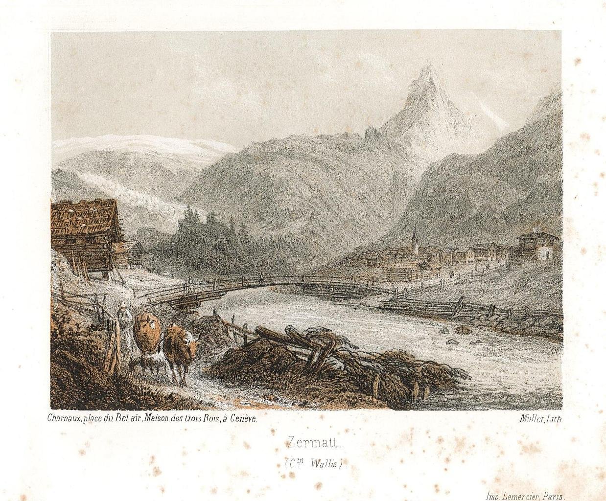 Veduta, antica ed originale, stampata a colori del Cervino e Zermatt. Stampata a Parigi dalla litografia Lemercier ed edita da Charnaux a Ginevra. Autore: Muller lith. Luogo: Cervino. Anno: 1840 ca. Tecnica: litografia. Dimensioni: 100x135. Leggero foxing