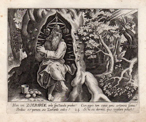 ZOERARDO EREMITA - THOMAS de LEU [Leeuw or Le Leup or Deleu] (1560-1612) "Haec toti ZOERARDE orbi spectacula proebes" Zoerard, nato in Polonia, fu monaco benedettino, col nome di Andrea, nell'abbazia ungherese di Zobor, presso Nitra (Neutra). Poi, col consenso dell'abate Filippo, si ritiro in una grotta presso l'odierna Skalka, sulle rive del fiume Waag, riprendendo la vita eremitica, da lui già sperimentata in Polonia, con rinnovato rigore di penitenze. Di giorno tagliava la legna nei boschi, la notte vegliava in preghiera su un tronco d'albero cinto di spine e di punte che gl'impedivano di cedere al sonno. In quaresima mangiava solo una noce al giorno, tanto che svenne più volte per la fame.